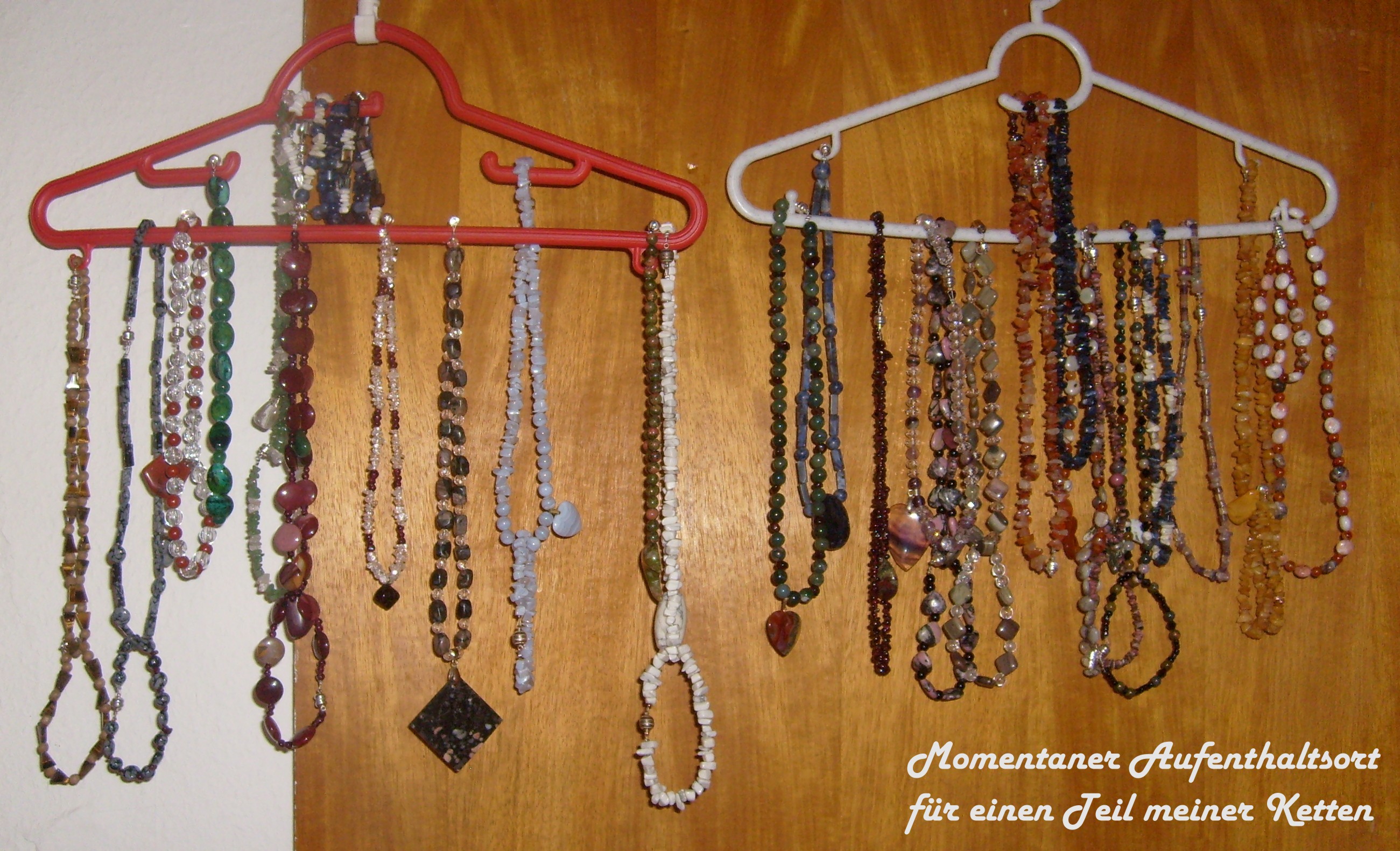 ich habe meine Anhänger und Ketten an Haken in meiner Vitrine aufgehängt und einen Teil der Ketten über den Rand einer Glasvase die oben Spitzen wie eine Königskrone hat aufgehängt, stell mal Bilder mit ein, ok.
