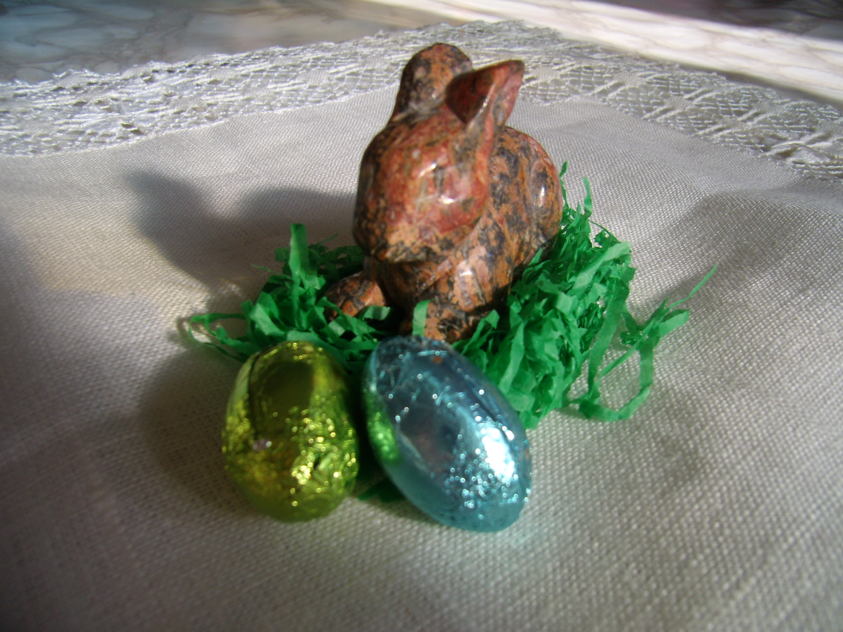 So ... und was war in meinem Packerl .... ein Rosenquarz-Scheibenstein, ein schwarzer Ring (aber welcher Stein) ... und Schokoeier, die teilweise bereits vernichtet sind