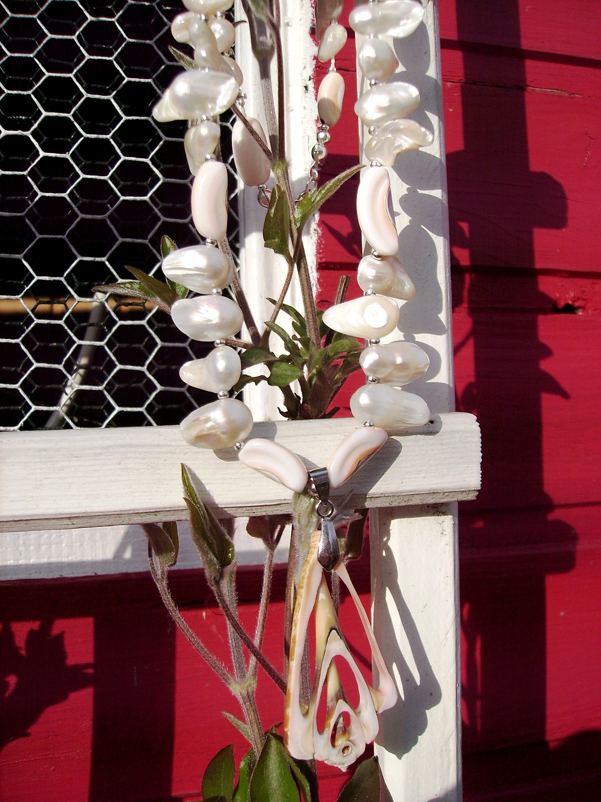 natürliche Süsswasserperlen, Muschelstücke und ein Muschelquerschnitt