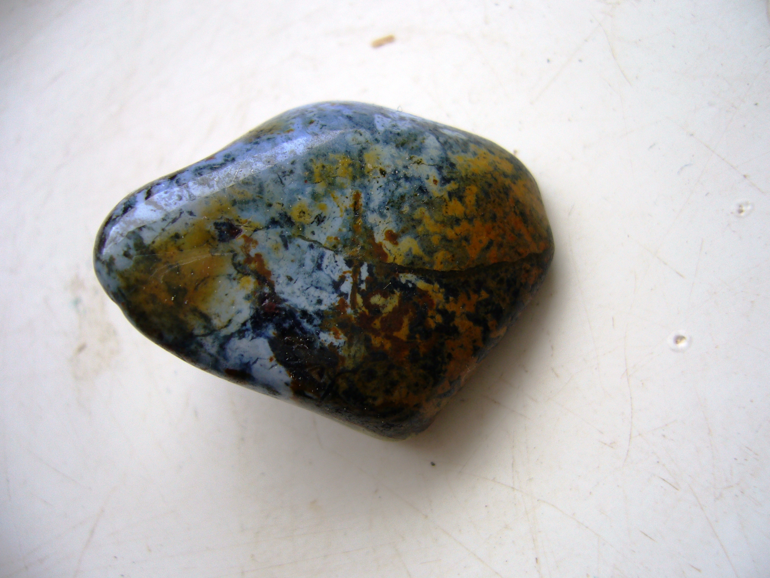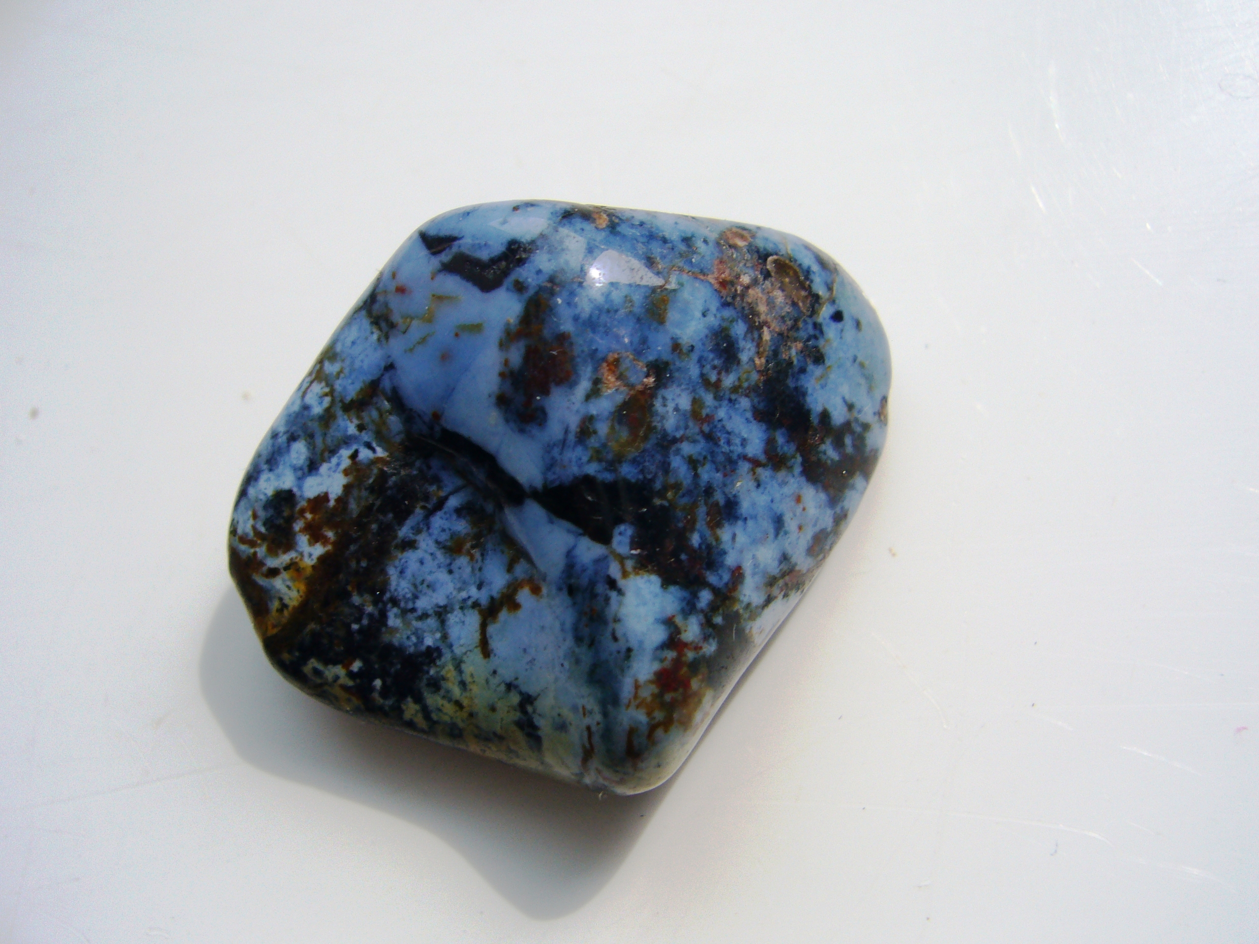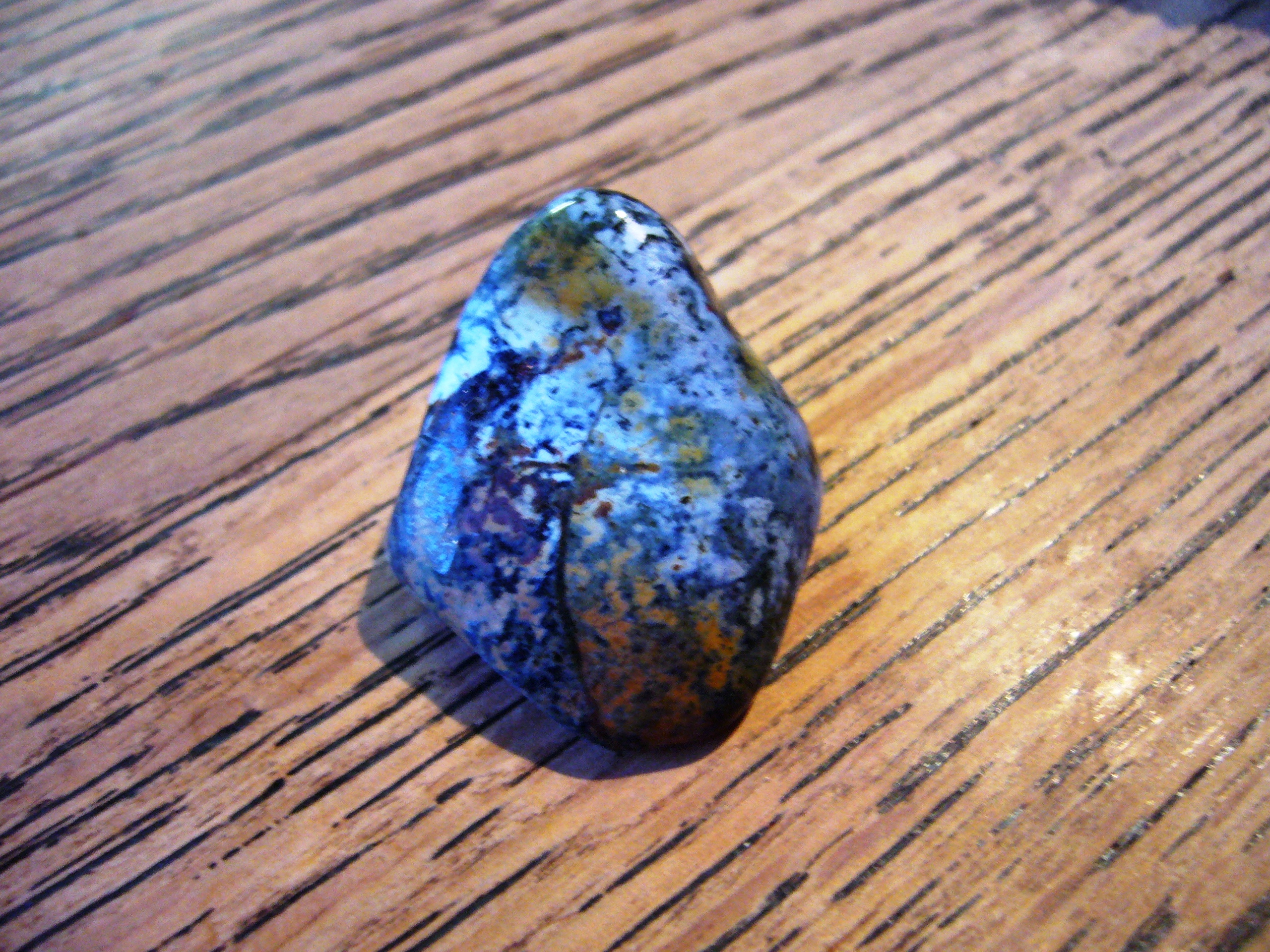 aber dies ist einer meiner lieblingssteine und ich habe 4 stück davon, die deinem bild sehr ähnlich sehen... dunkelblaue "krümelchen" auf mittelblauem hintergrund. der hintergrund wiederum zeigt farbverläufe ins gelblich braune, manchmal auch ins grüne, je nach stein. (nur sind meine steine unbelichtet etwas dunkler, bzw kräftiger in der farbe).