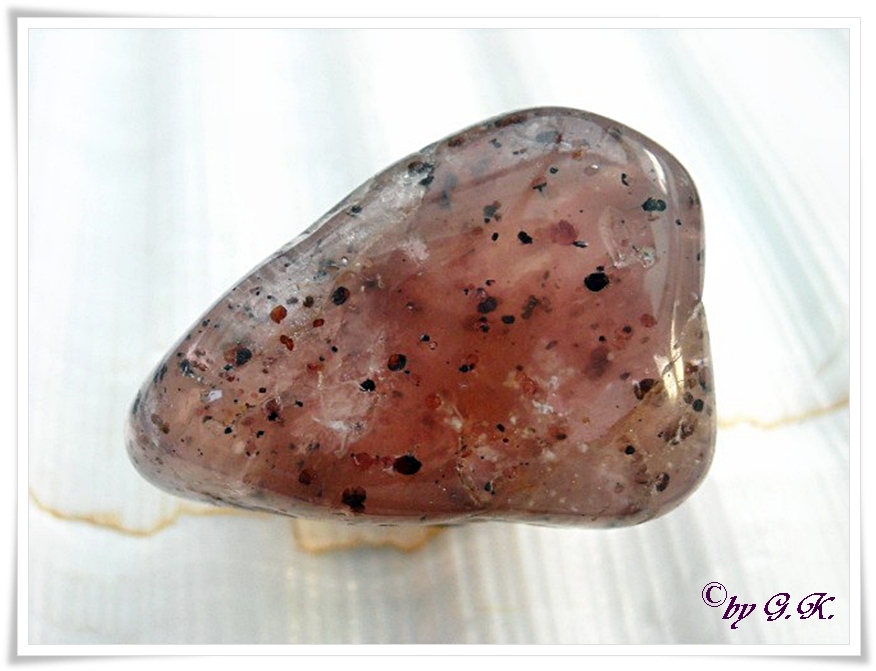 Mineralogisch ist dieser Stein sehr interessant denn er besteht aus Quarz mit Granat, Zirkon und Goethit Einschlüssen.