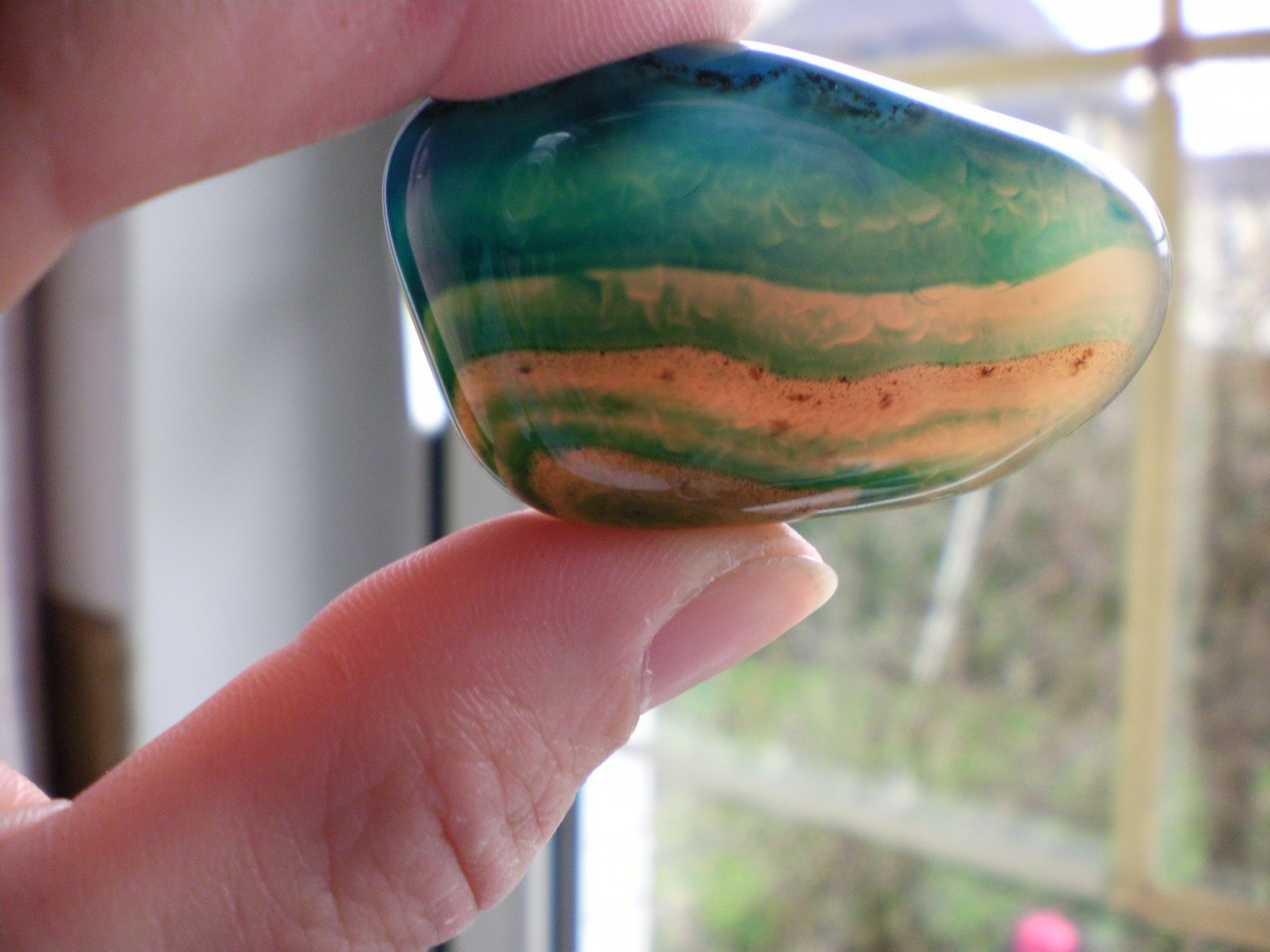 Der zweite mag sich so gar nicht fotografieren lassen. Er ist im oberen Bereicdh dunkelgrün und an einer Seite direkt gegen das Licht ganz leicht durchscheinend. Der untere Bereich ist nicht durchscheinend und wunderhübsch rosarot gemustert.