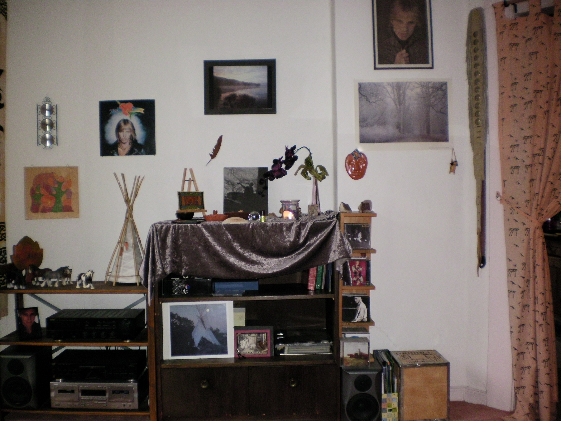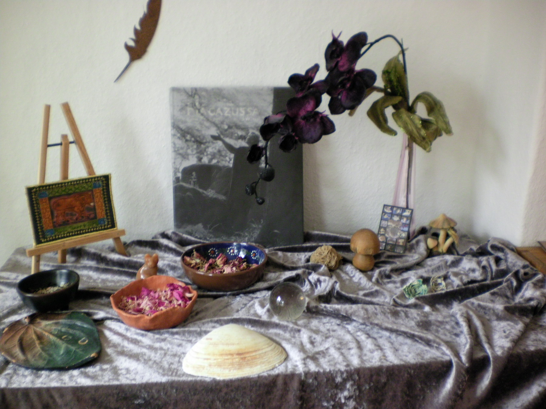 Einen allgemeinen Altar habe/hatte ich auch. Wird es auch nochmal geben, allerdings muss dazu erst noch ein bisschen um- und aufgeräumt werden. An dem wird "gearbeitet". Also Kerzen geweiht, Mojo-Säckchen gemacht usw.