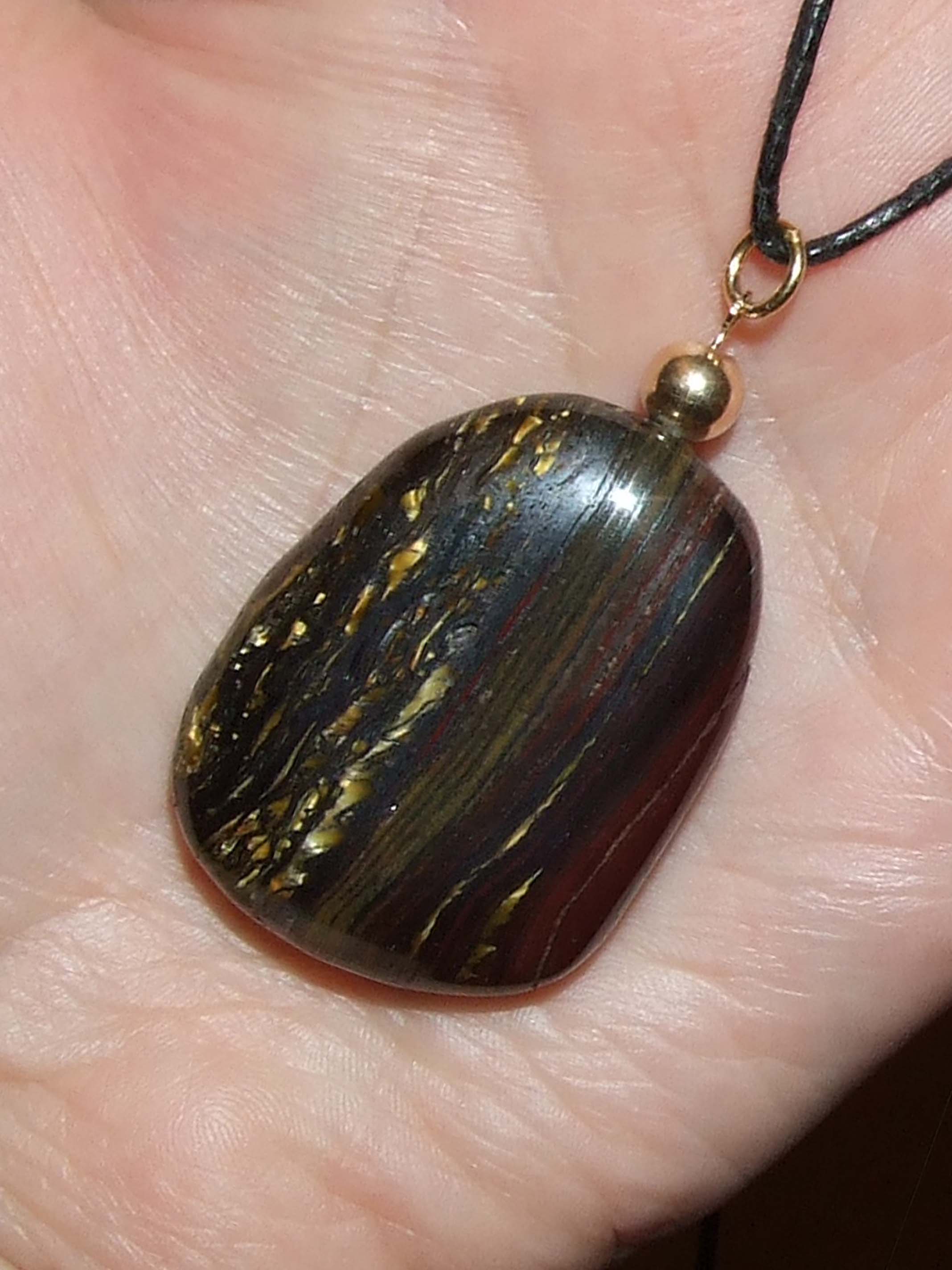 Da in dem Tigereisen auch schöne Goldtöne zu sehen sind, die wundervoll funkeln, habe ich ihn mit vergoldeten Silberzubehör verarbeitet. Also ich habe ihn auf einen Stift aufgezogen und mit einer 6 mm großen vergoldeten Kugel und Bindering versehen und an einem schwarzen langen Lederband befestigt.