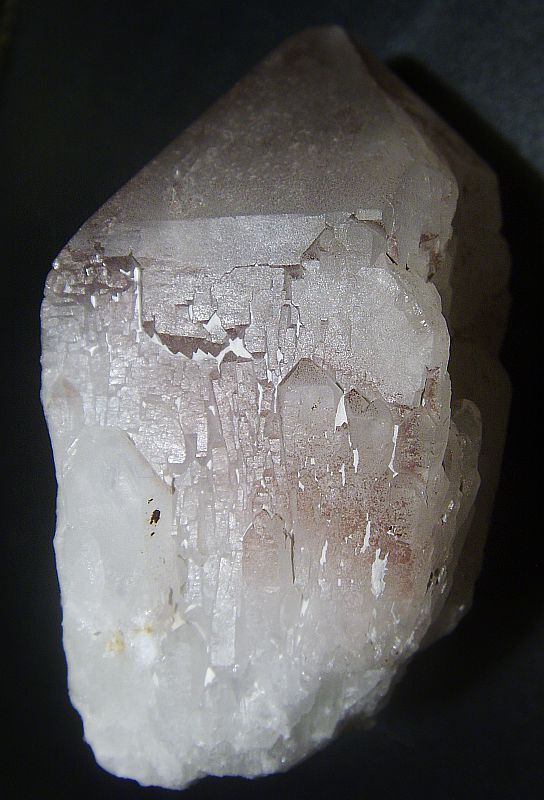Ist zuerst der Grosse gewachsen? Es sieht so aus, als hätten die Resourcen (Kieselsäure) am Schluss nicht ganz ausgereicht, um die Flächen komplett aufzufüllen. Oder waren es äussere Einflüsse (z.B. Erschütterungen), die den Kristall aus dem Konzept brachten? Vielleicht ist der Grosse gegen Ende seines Wachstums an jüngere Kristalle gestossen, die er sich "einverleibte". Dies Bild wäre meines Erachtens - übertragen auf einen menschlichen Lehrer - charakterlich ziemlich bedenklich. Schliesslich sollte der Lehrer die Schüler nicht auf eigene Kosten "verkürzen", sondern sie als Individuen fördern, dass sie ihr eigenes Wesen voll entfalten. Möglicherweise war es aber auch ein Kompromiss, sich gegenseitig zu ergänzen und so "vollkommen" zu werden, weil einfach die Resourcen oder erschwerte Umwelt-Bedingungen die je eigenen Individualitäten im Wachstum begrenzten. Dann wäre der Mentor wie ein Vater oder eine Mutter, die die Unfertigen aufnimmt und ihrer Unvollkommenheit Vollendung verleiht.